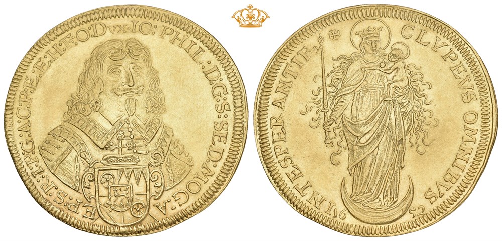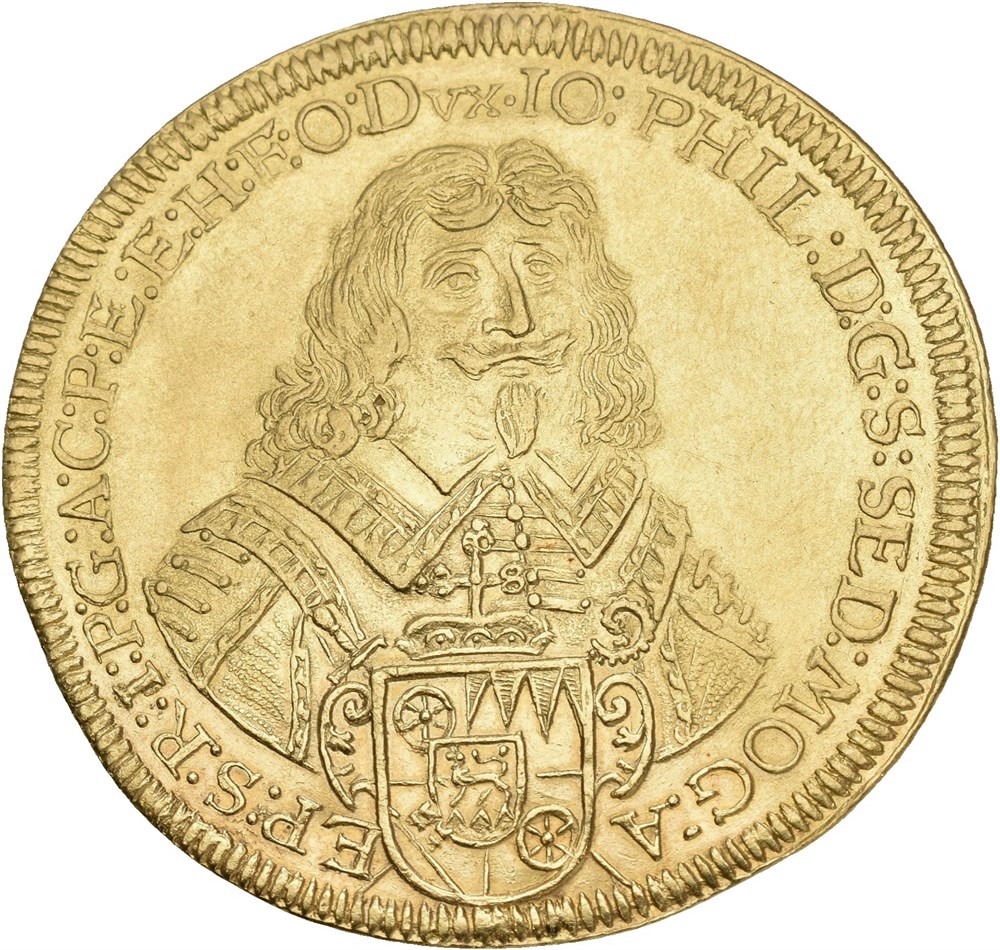 5 ducats 1652 (17.08 g). Nürnberg mint. Mount removed at 12 o' clock and slightly creased. A rare gold strike from the taler dies