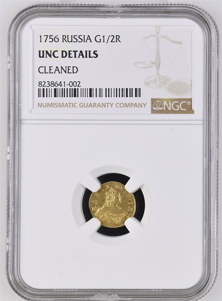 Poltina (1⁄2 rouble) 1756. Red mint (Moscow). Graded UNC Details Cleaned by the NGC