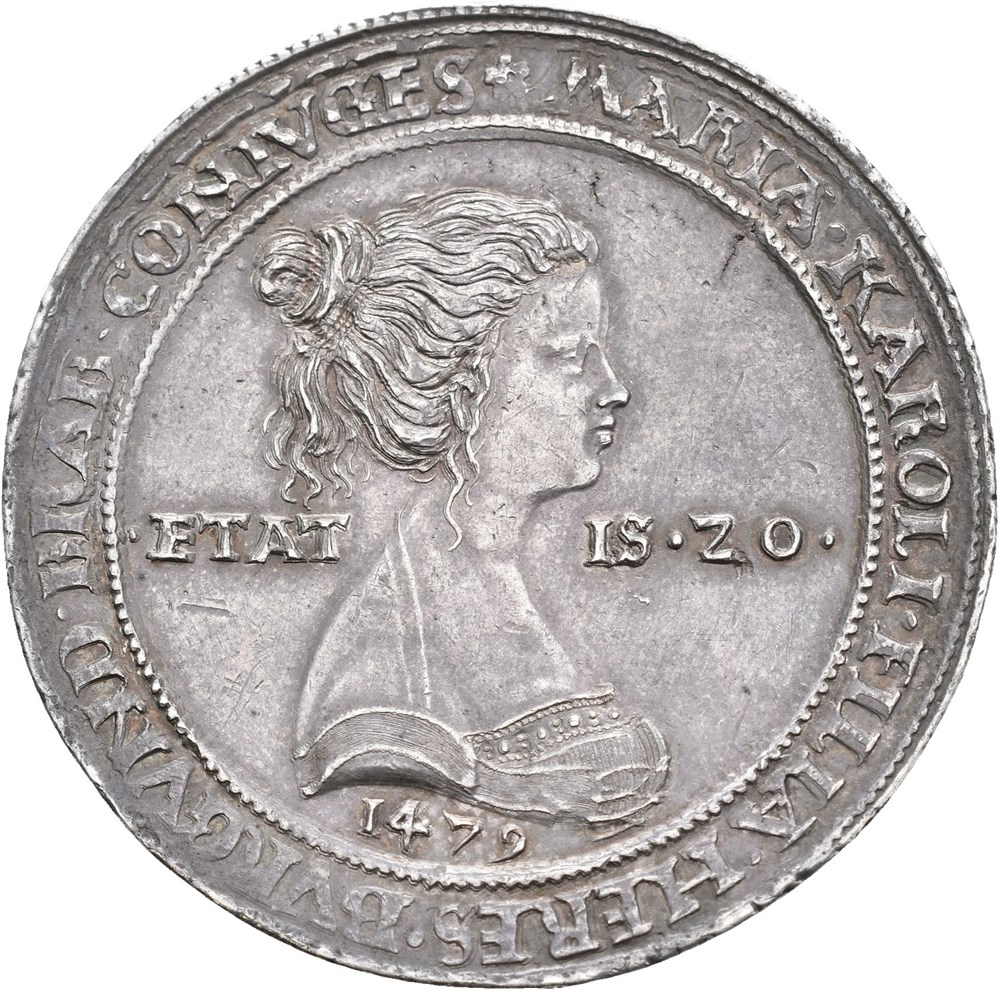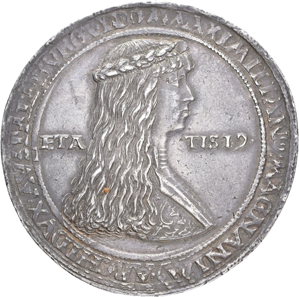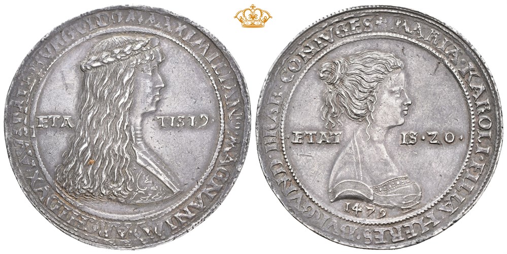 Schauguldiner n.d. (after 1511) (30.39 g). Hall mint. Dies by Ulrich Ursenthaler. Struck to commemorate the wedding of Maximilian I (1459-1479) as Duke of Austria and Burgundy, and Maria, Duchess of Burgundy (1457-1482) in 1477. Wonderful deep old cabinet toning. Very rare