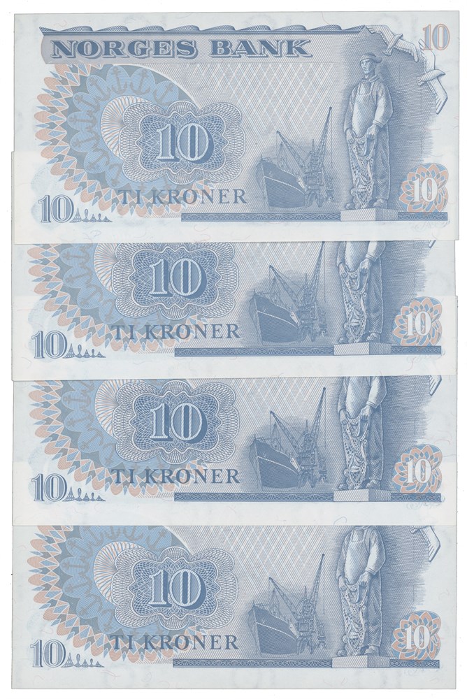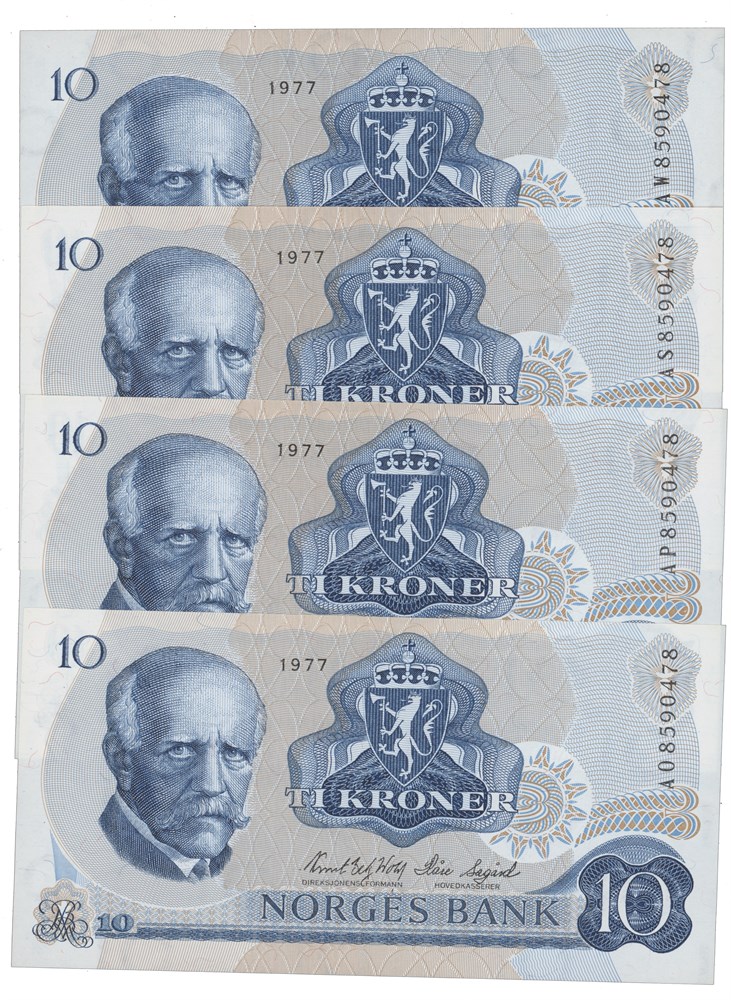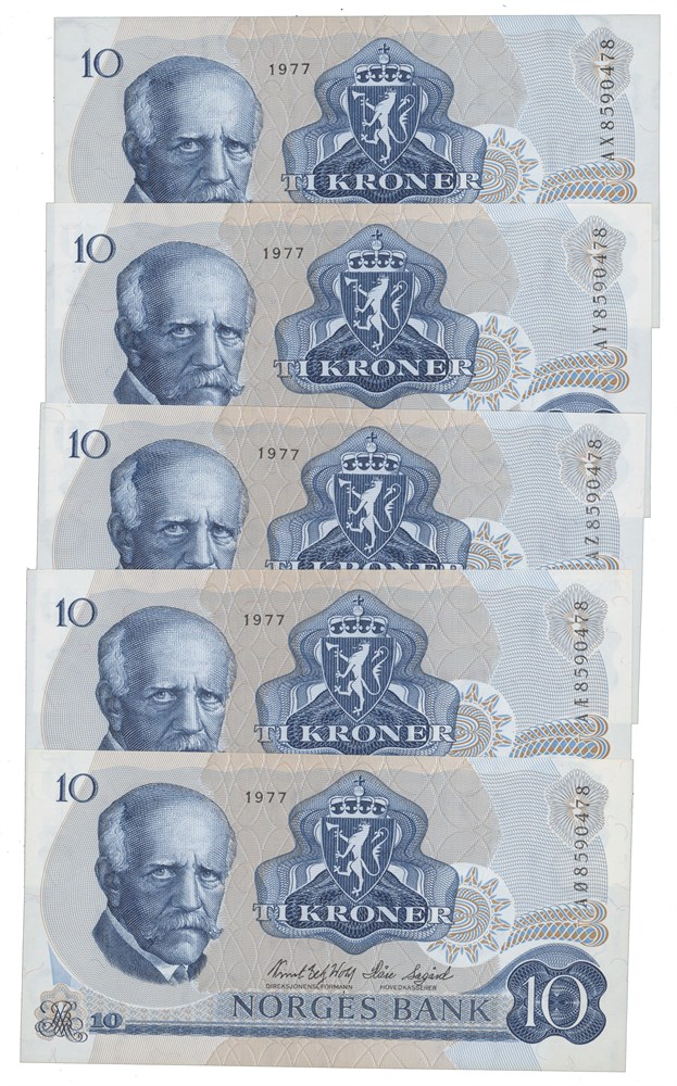 Lott 9 stk. 10 kroner 1977 AO, AP, AS, AW, AX, AY, AZ, AÆ og AØ, alle med samme serienummer, 8590478.