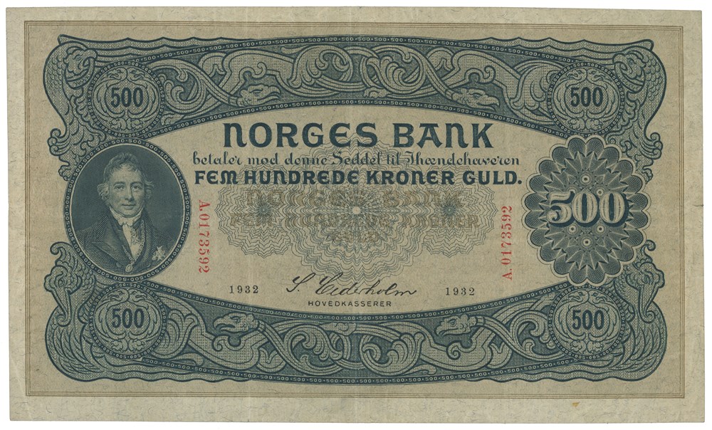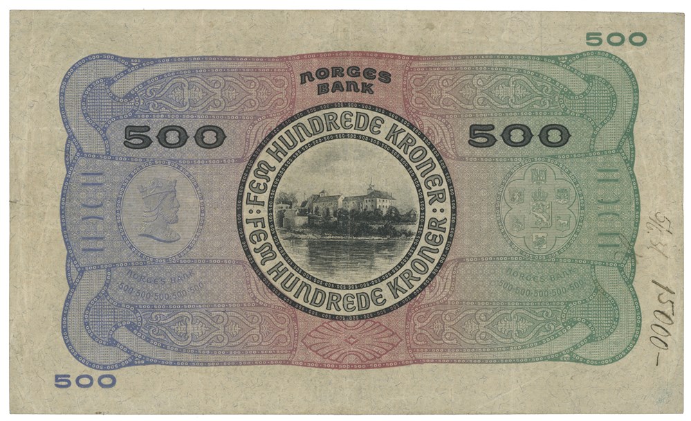 500 kroner 1932. A.0173592. Skrift på baksiden og liten rift/writing on reverse and small tear. Sjelden/rare.