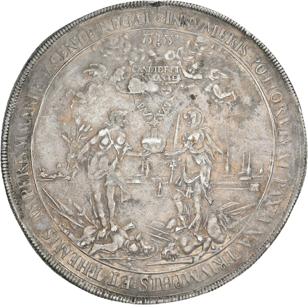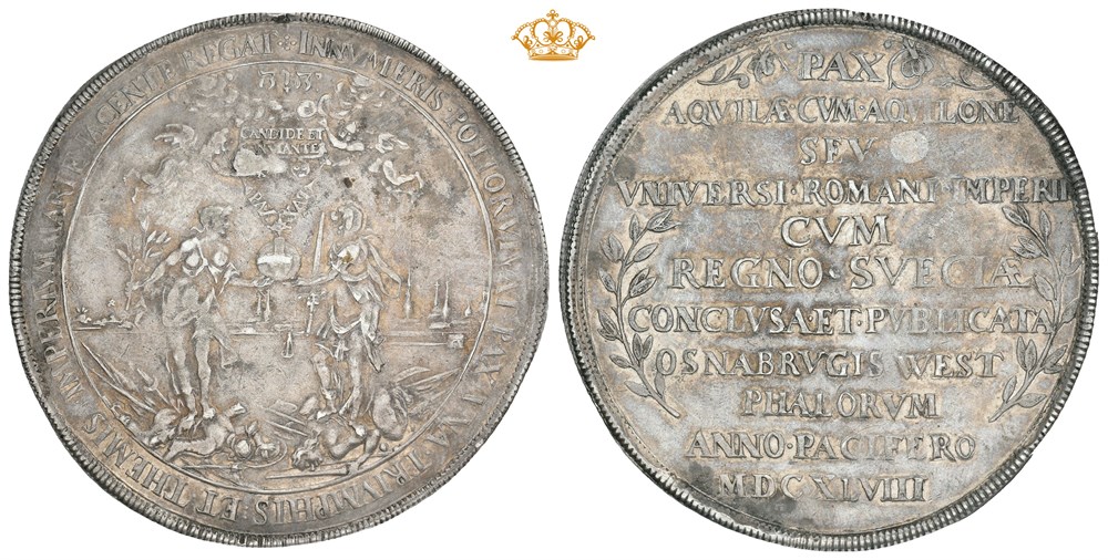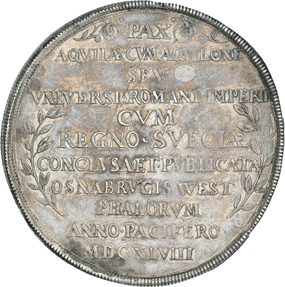 1 1/2 schautaler 1648 (60 mm; 41.75 g). Unsigned, by E. Ketteler. Struck to commemorate the peace treaty between The Holy Roman Empire and the Kingdom of Sweden that was signed in the cities of Münster and Osnabrück in October 1648. Light deposits and minor edge flaw