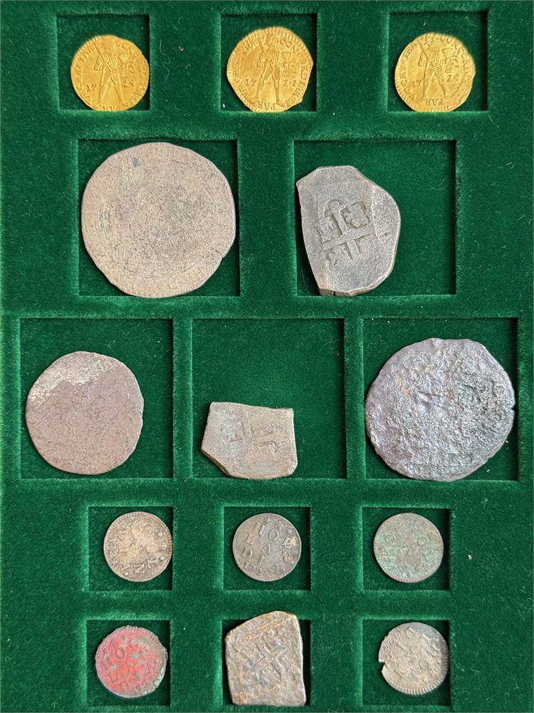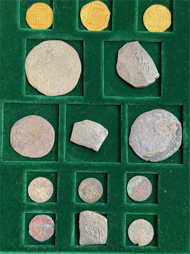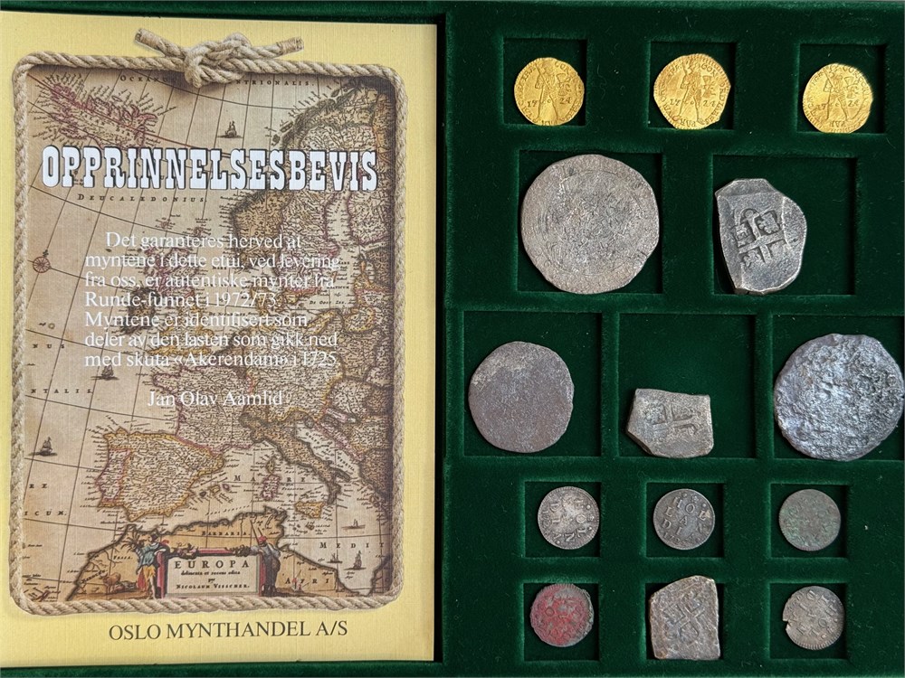 Original promotion set (Rundesett) of 14 coins from the Akerendam Treasure. Three gold ducats 1724 from Utrecht; two Dutch dukatons; one Dutch 1/2 dukaton; five 2 stuivers 1724 from Holland; one Mexican 8 reales cob; 2 Mexican 4 reales cobs. The ducats are in near mint state condition and the two stuivers are fully readable. The ducatoons are corroded and unattributable. Comes with the original collector's case and certificate