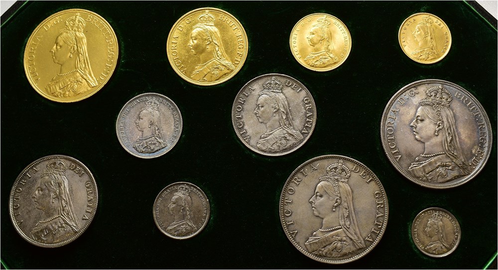 Specimen set 1887 Jubilee head. Set comprising of Five and Two Pounds, Sovereign and Half-Sovereign, and Crown to Threepence. London mint. Five Pounds and Two Pounds lightly rubbed/cleaned. Coins graded extremely fine or better. Comes in original green fitted case