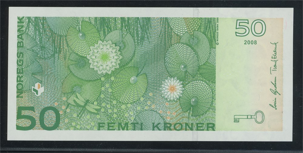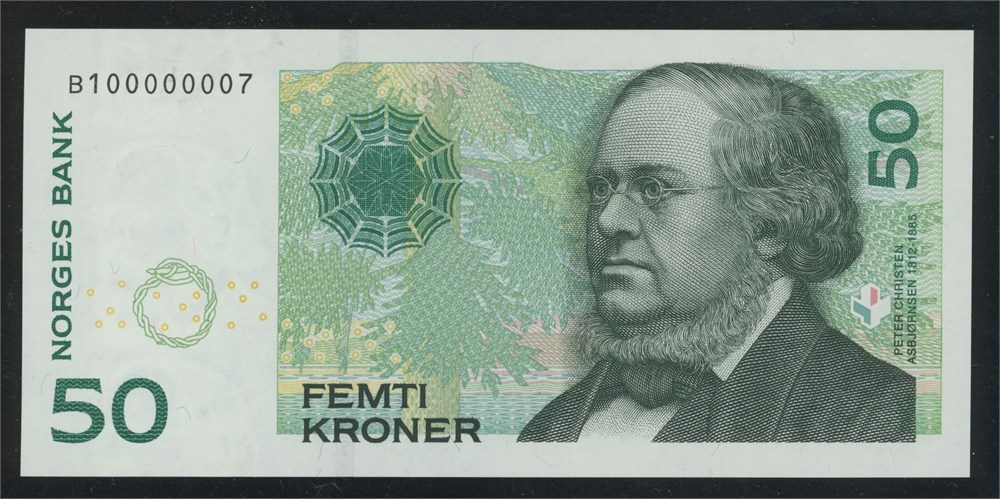 50 kroner 2008. B100000007. Veldig lavt serienummer, fra øvre venstre hjørne i ark nummer 7 som ble trykket.