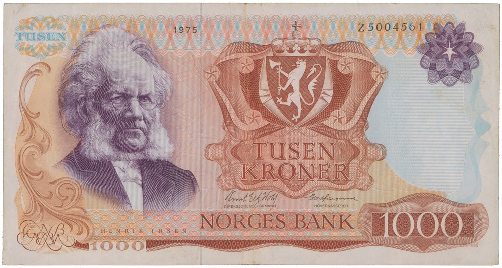 1000 kroner 1975. Z5004561. Erstatningsseddel/replacement note (5-million), liten rift/small tear, sjelden/rare.