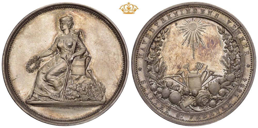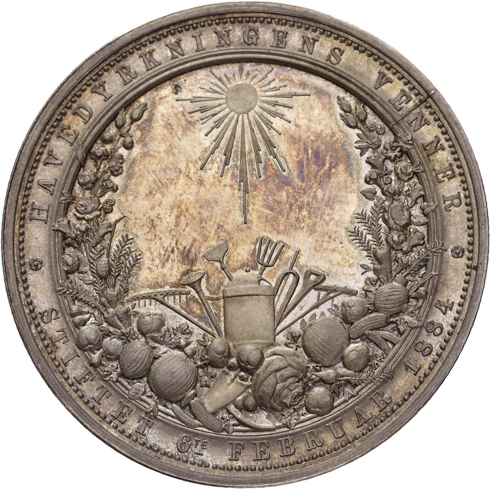 Havedyrkningens venner, stiftet 6. februar 1884. Throndsen. Sølv 45 mm; 39,1 g. I originalt etui.