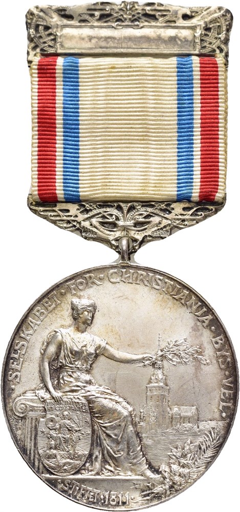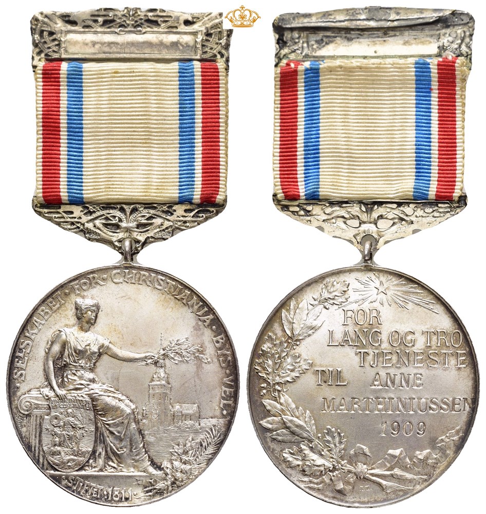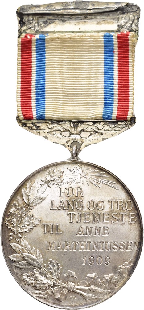 Selskabet for Christiania Bys Vel, med bånd og agraff. Belønningsmedalje for lang og tro tjeneste. Throndsen. Sølv 35 mm; 17,26 g. "Anne Marthinussen 1909" inngravert på revers