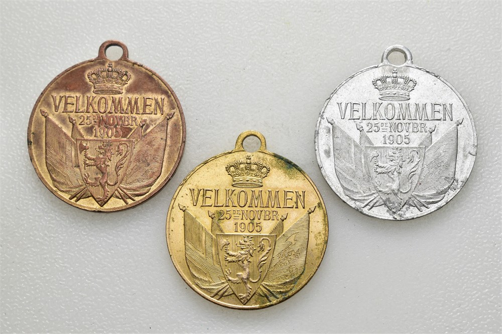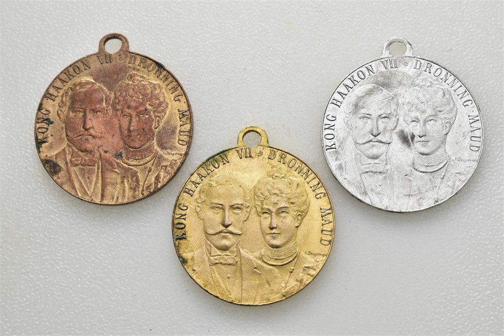 Kong Haakon VII og Dronning Maud, Velkommen 1905. Throndsen. Lot 3 medaljer med hempe i aluminium, bronse og forgylt bronse. 27 mm. Flekker/spots