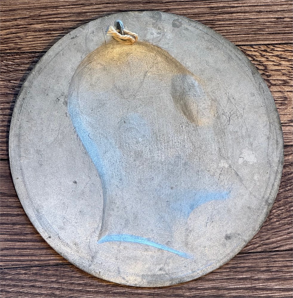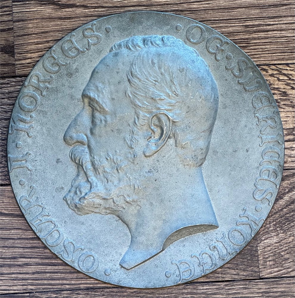 Ensidig rund plakett med portrett av Kong Oscar II. Med hempe. Signert Throndsen. Aluminium 180 mm; 200 g