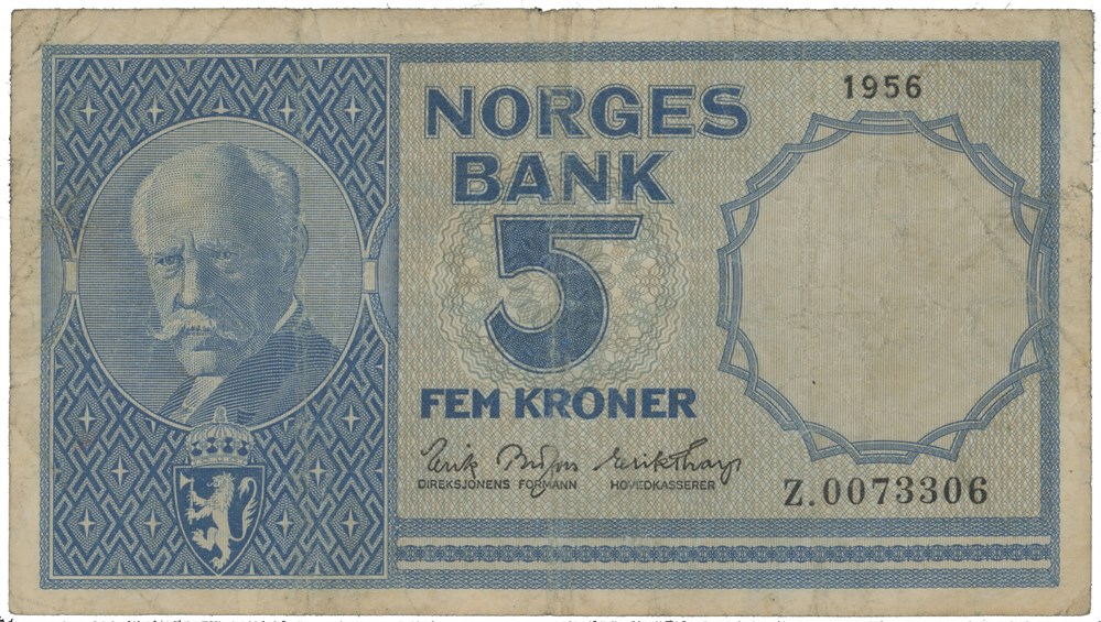 5 kroner 1956. Z.0073306. Erstatningsseddel/replacement note (0-million). Meget sjelden/very rare.