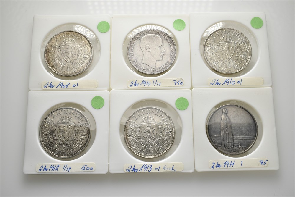 - Lot 6 stk. 2 kroner 1908, 1910 (2), 1912, 1913 og 1914 jub. (15011199)