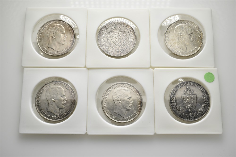 Lot 6 stk. 2 kroner 1908, 1910 (2), 1912, 1913 og 1914 jub.