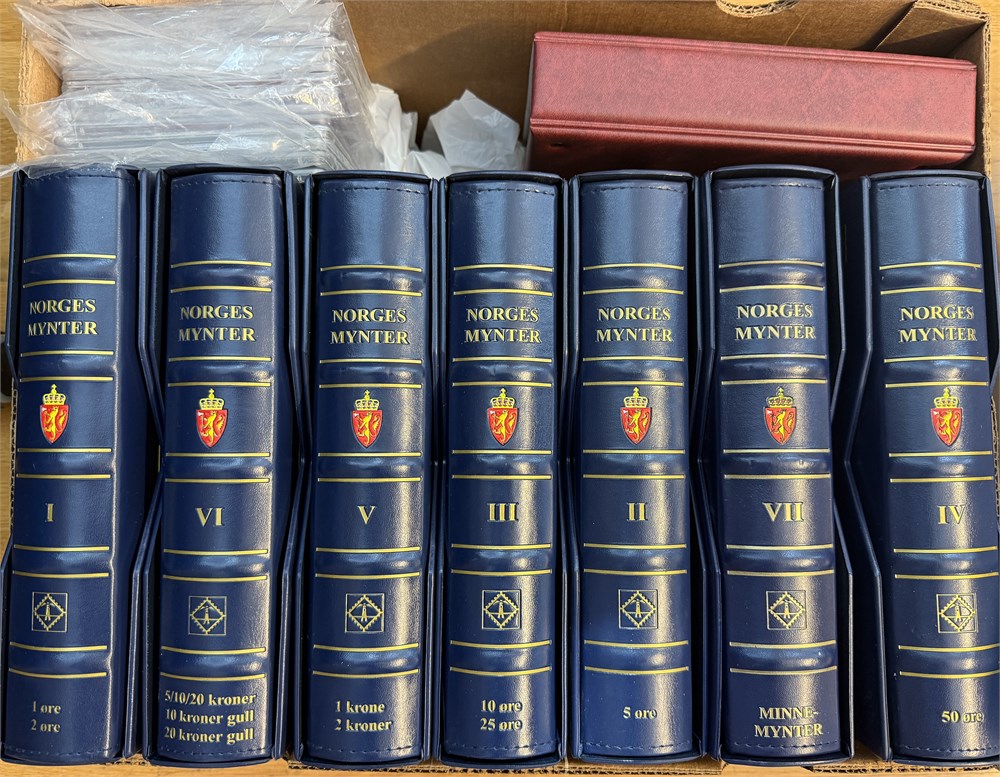 Samling i flere album fra Leuchtturm med norsk årgangsmynt, flere sølvmynter observert, f.eks. 2 kroner 1906. Samlingen består for det meste av sirkulerte mynter, albumene fremstår nesten som nye.