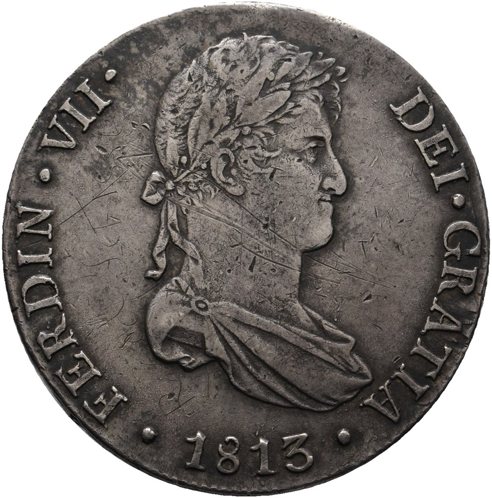 Ferdinand VII 1811-1821. AR 8 reales 1813 (LIMAE) JP, Lima Mint, 27,06 grams. Graffiti obverse field.