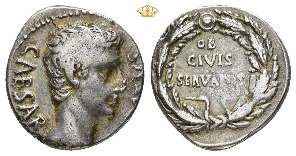 Augustus 27 BC - 14 AD. AR Denarius struck circa 19-18 BC, uncertain spanish mint, 3,84 grams, 18mm. Obverse: CAESAR AVGVSTVS, head of Augustus, facing right. Reverse: OB CIVIS SERVATOS, legend in three lines within a wreath.