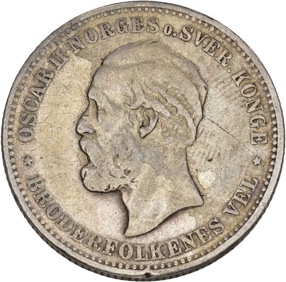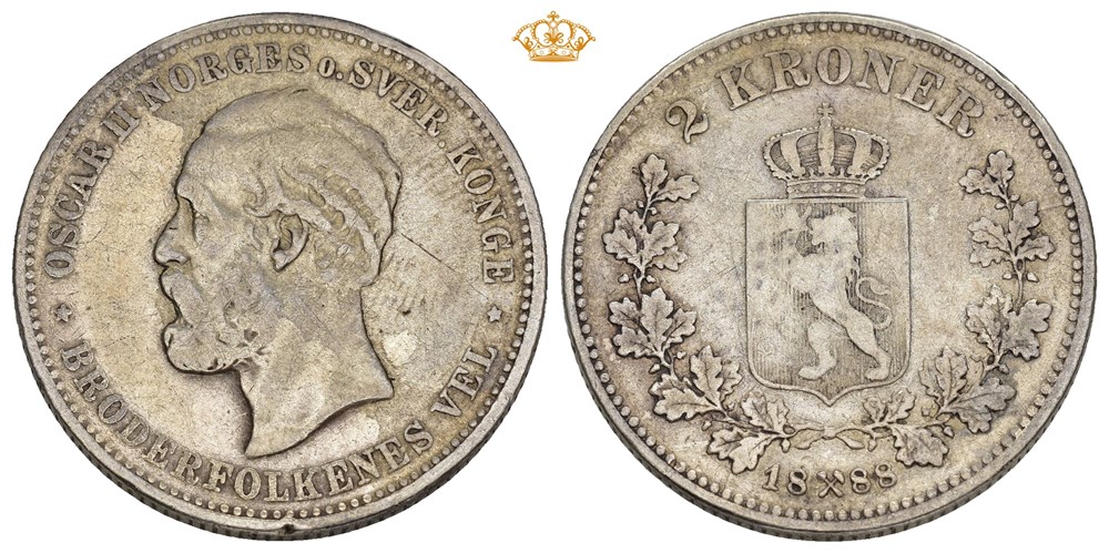 2 kroner 1888. Liten kantskade/minor edge nick. Liten ripe/minor scratch