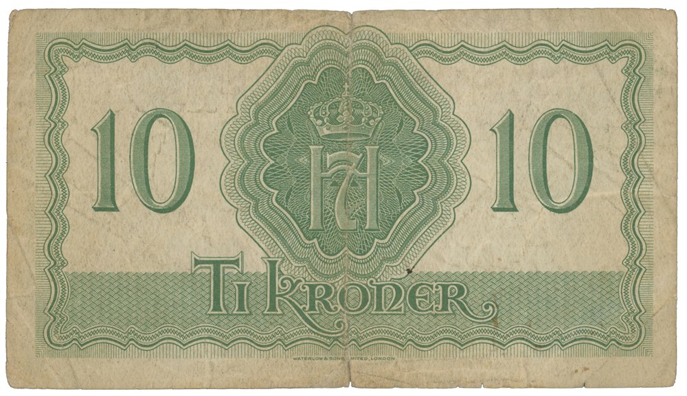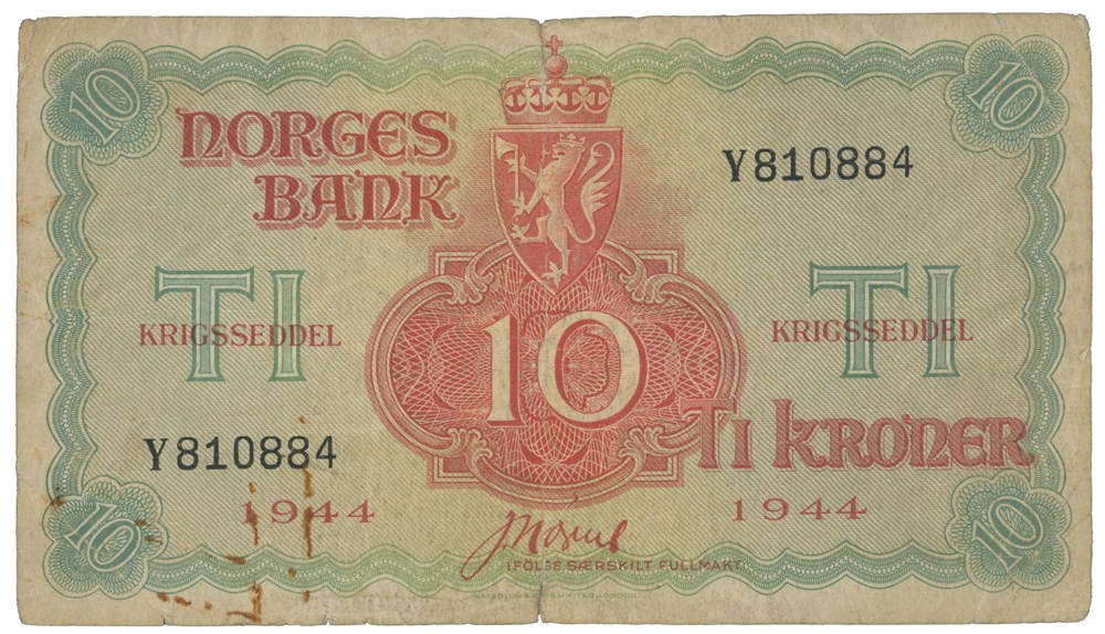10 kroner 1944 Y810884 London, rifter i midten oppe og nede, rustflekker