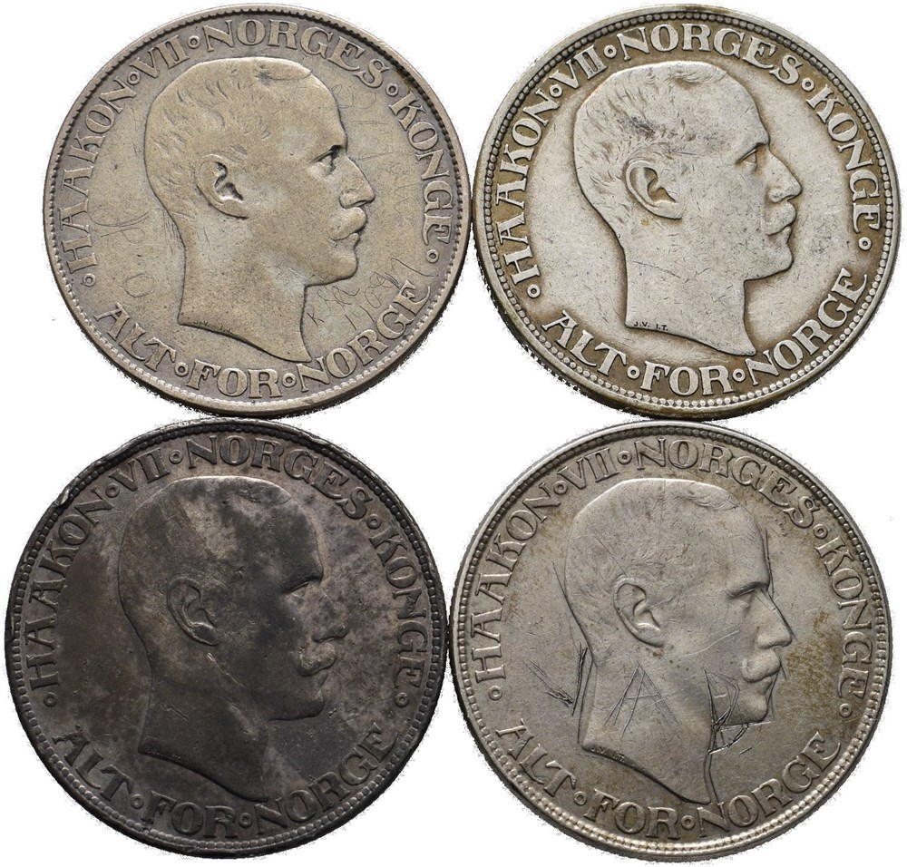 2 kroner 1908, 13, 14 og 17, alle med anmerkninger