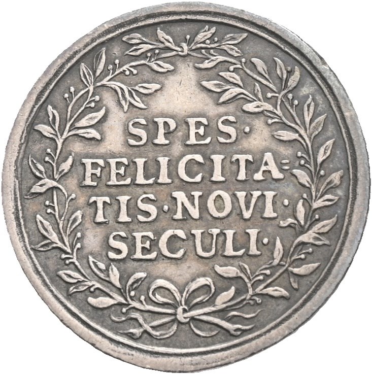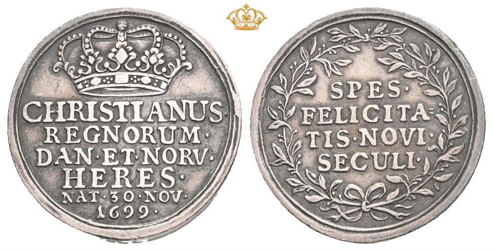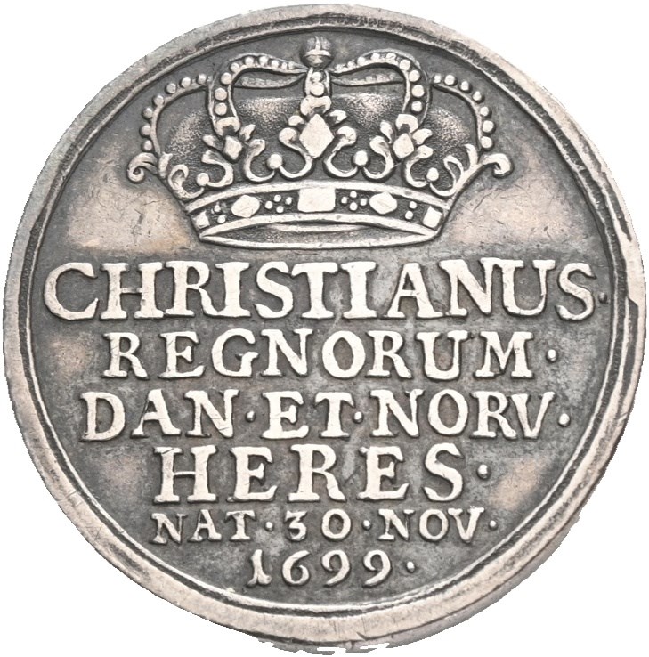 Birth of Crown Prince Christian, 1699. Silver, 26mm, 10,55 g. Obverse: HRISTIANUS REGNORUM DAN ET NORV HERES NAT 30 NOV 1699. Reverse: SPES FELICITATIS NOVI SECULI. Patina.