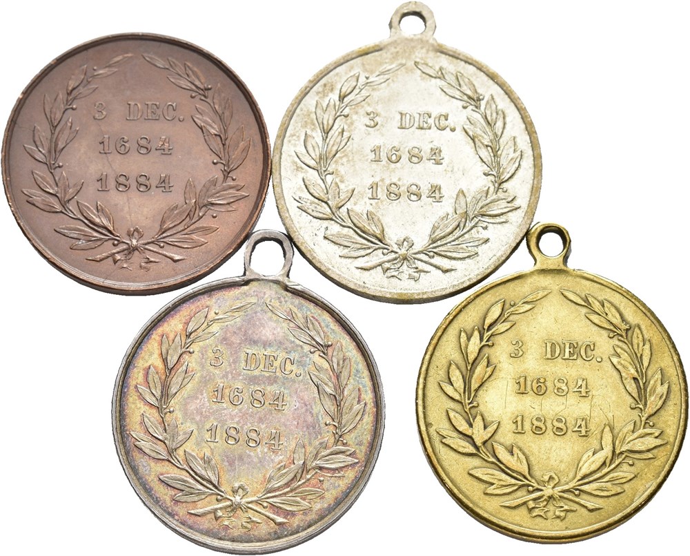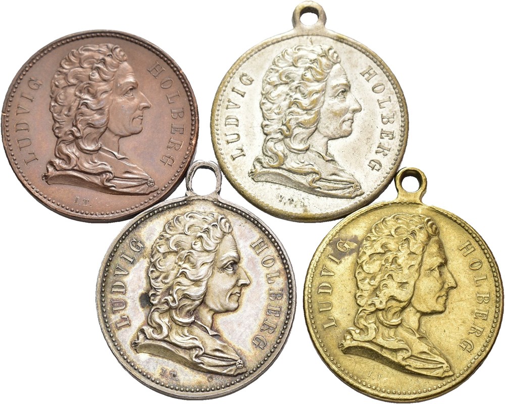 Ludvig Holberg (1684-1754). Throndsen. Lott 4 medaljer i sølv, forsølvet sølv, messing og bronse u/h 21 mm