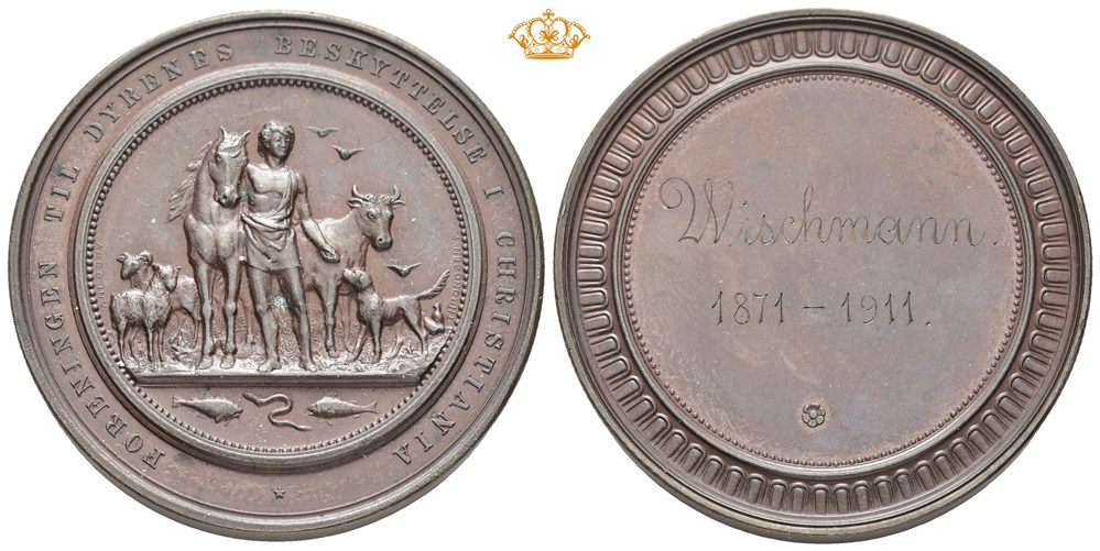 Foreningen til Dyrenes beskyttelse i Christiania 1886. Throndsen. Bronse 50 mm. 52,82 g. "Wischmann 1871-1911" inngravert på revers