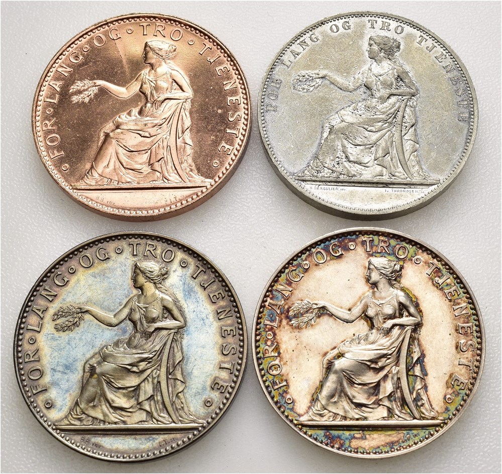 For lang og tro tjeneste. Bergslien/Throndsen. Lott 4 medaljer: Tinn (inngravert "Prøve" i randen), bronse og sølv (2). 42 mm