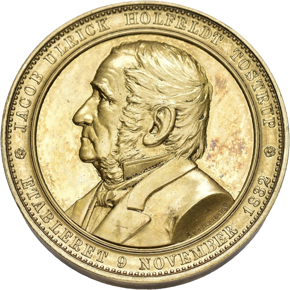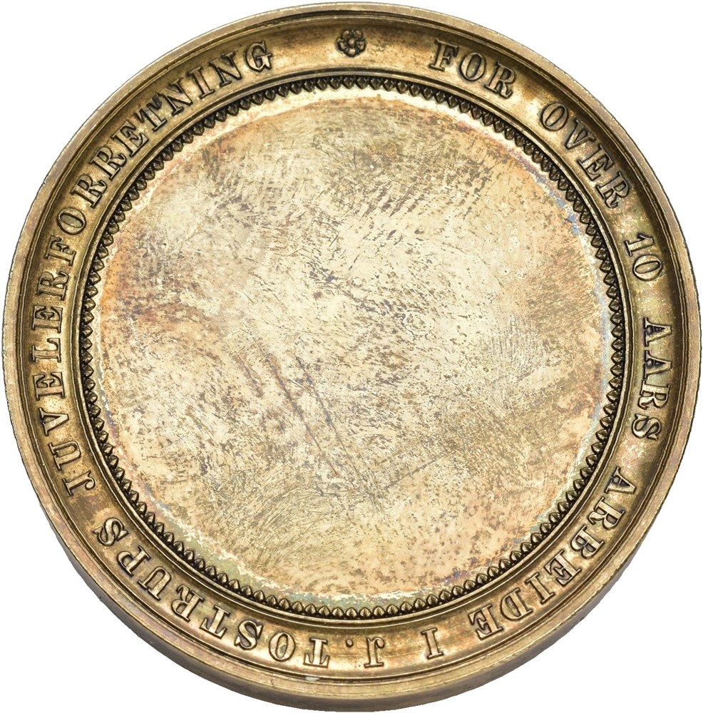 Jacob Ulrick Holfeldt Tostrup. For over 10 års arbeide i J. Tostrups juvelforretning. Throndsen. Forgylt bronse 40 mm. 44,25 g
