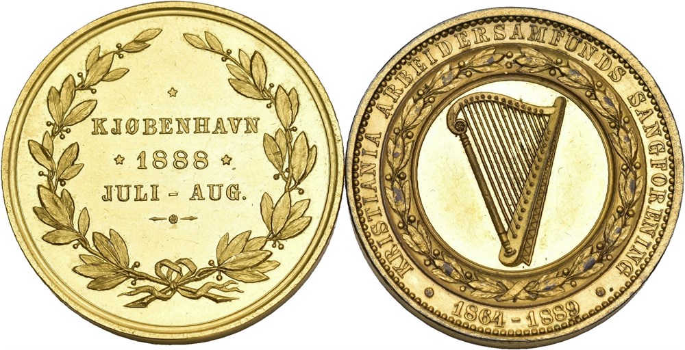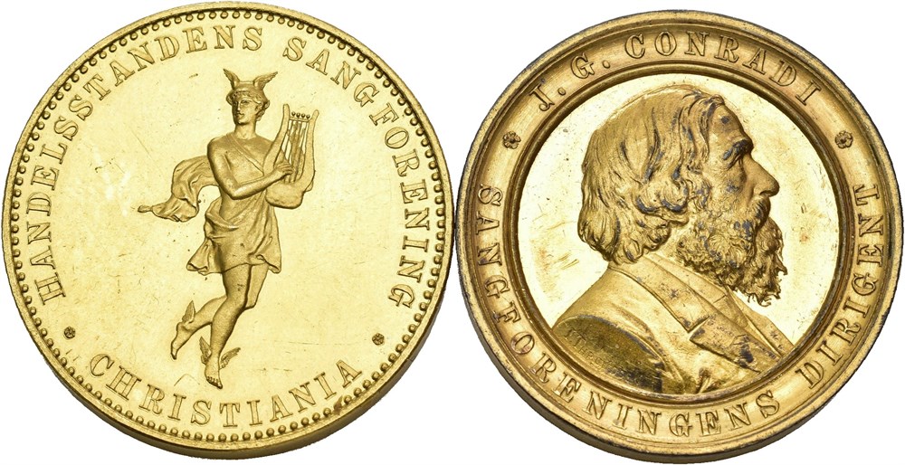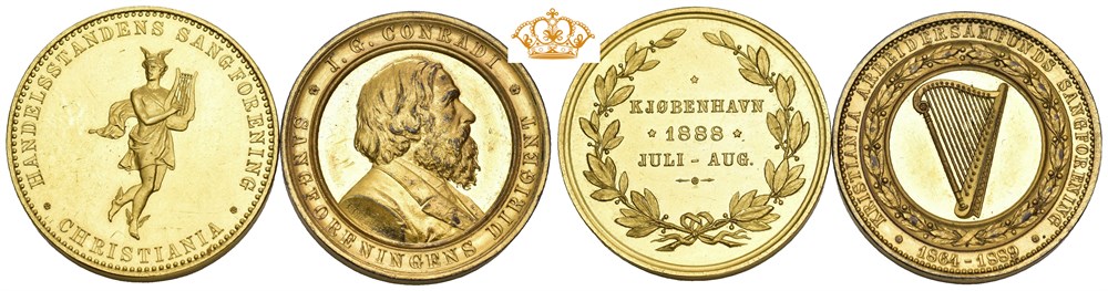 Handelsstandens sangforening Christiania 1888 og J. G. Conradi sangforeningens dirigent. Throndsen, lott 2 medaljer i forgylt bronse 31 mm. Riper på advers på S.&H.44