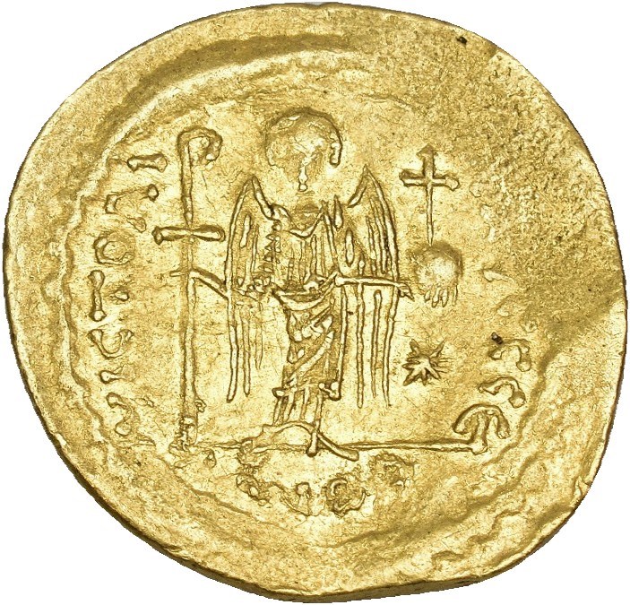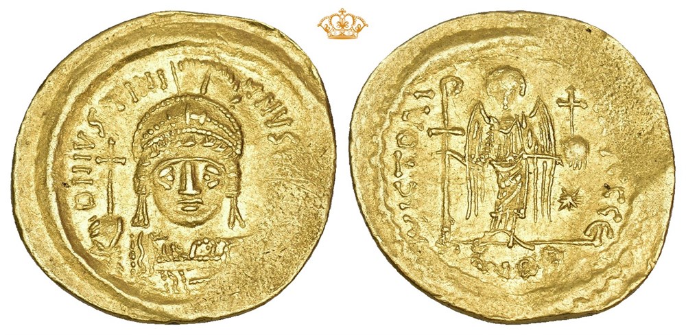 Justinian I 527-565 AD. AV Solidus (21 mm; 4.20 g). Constantinople mint, struck circa 545-565 AD. Obverse: D N IVSTINIANVS (PP AVG), Helmeted and cuirassed bust of Justinian I facing, holding globus cruciger in his right hand and shield in left. Reverse: VICTORI(A AV)GGG Є - CONOB, Angel standing facing, holding long staff surmounted by staurogram in right hand and globus cruciger in left; star in right field. Weak peripheral strike. Some remaining luster in fields.