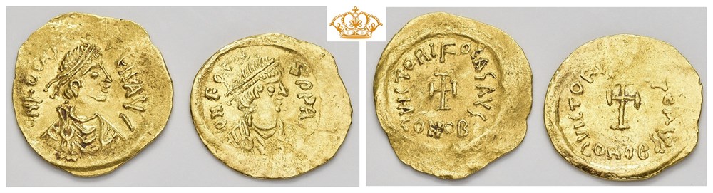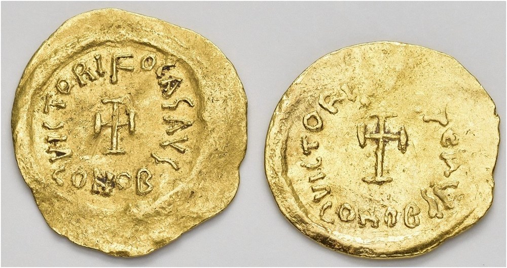 Phocas 602-610 AD. AV Tremissis. Constantinople mint, struck 602-610 AD. Obverse: d N FOCAS P P AVG, Diademed, draped and cuirassed bust of Phocas right. Reverse: VICTORI FOCAS AVG - CONOB, Cross potent. Wavy flan. TWO COINS IN LOT.