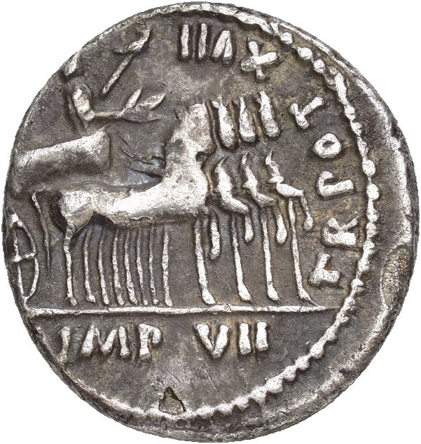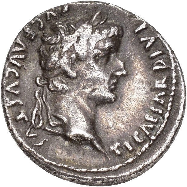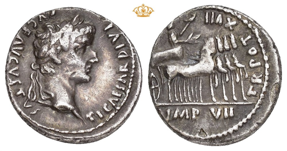 Tiberius 14-37 AD. AR Denarius (19 mm; 3.66 g). Lugdunum mint, struck circa 15-16 AD. Obverse: TI CAESAR DIVI AVG F AVGVSTVS, Laureate head of Tiberius right. Reverse: TR POT XVII - IMP VII, Tiberius advancing right in triumphal quadriga, holding scepter in left hand and branch in right. A few marks on obverse. Deeply toned.