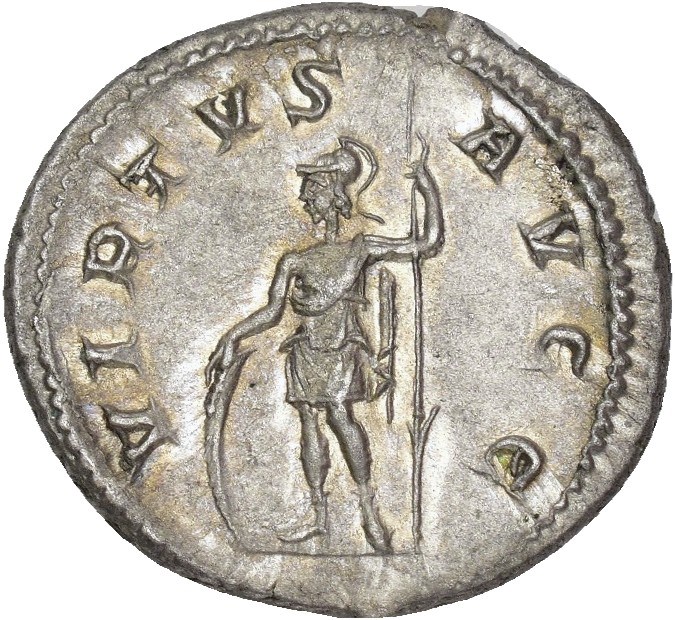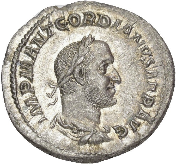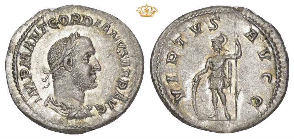 Gordian II, April 1st-22nd, 238 AD. AR Denarius (20 mm; 3.09 g), Rome mint. Obverse: IMP M ANT GORDIANVS AFR AVG, Laureate and draped bust of Gordian II right. Reverse: VIRTVS AVGG, Virtus standing, facing in military attire, head left, holding spear in left hand and resting right hand on shield set on ground. Well struck and attractively toned.