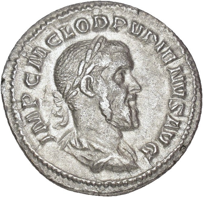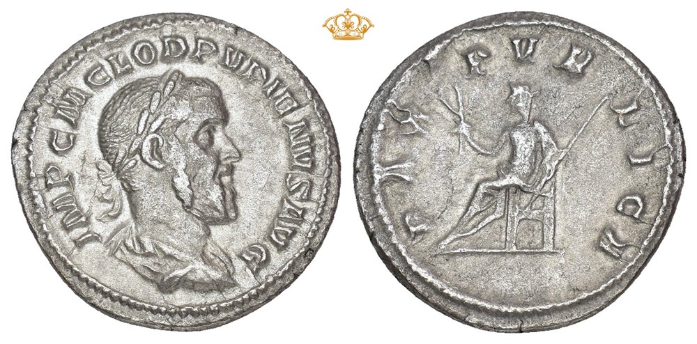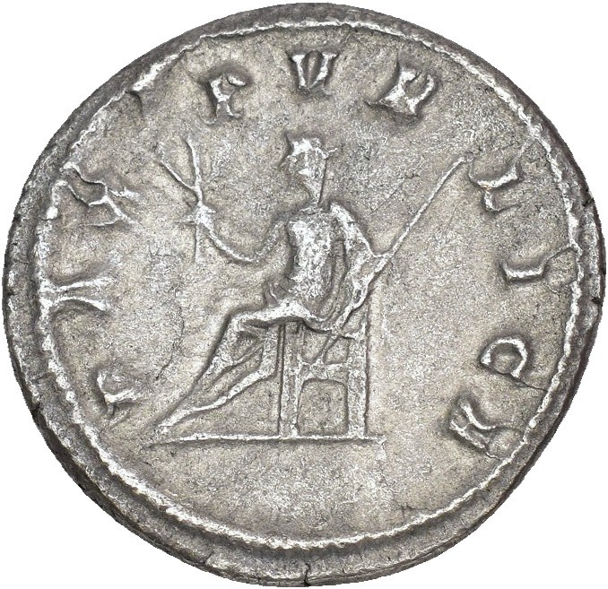 Pupienus 238 AD. AR Denarius (20 mm; 2.74 g). Rome mint. Obverse: IMP C M CLOD PVPIENVS AVG, Laureate and draped and cuirassed bust of Pupienus right. Reverse: PAX PVBLICA, Pax seated left on throne, holding olive branch in right hand and long scepter in left. Reverse struck with a slightly worn die. Toned.