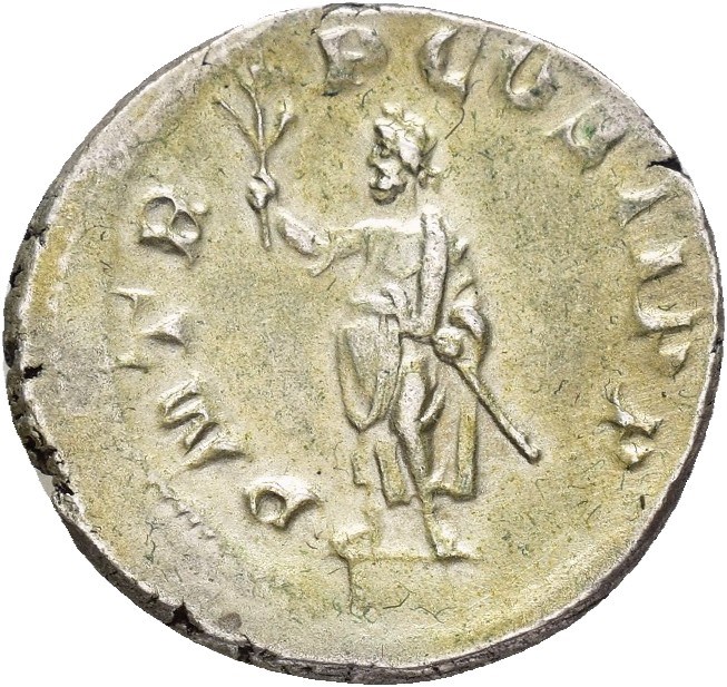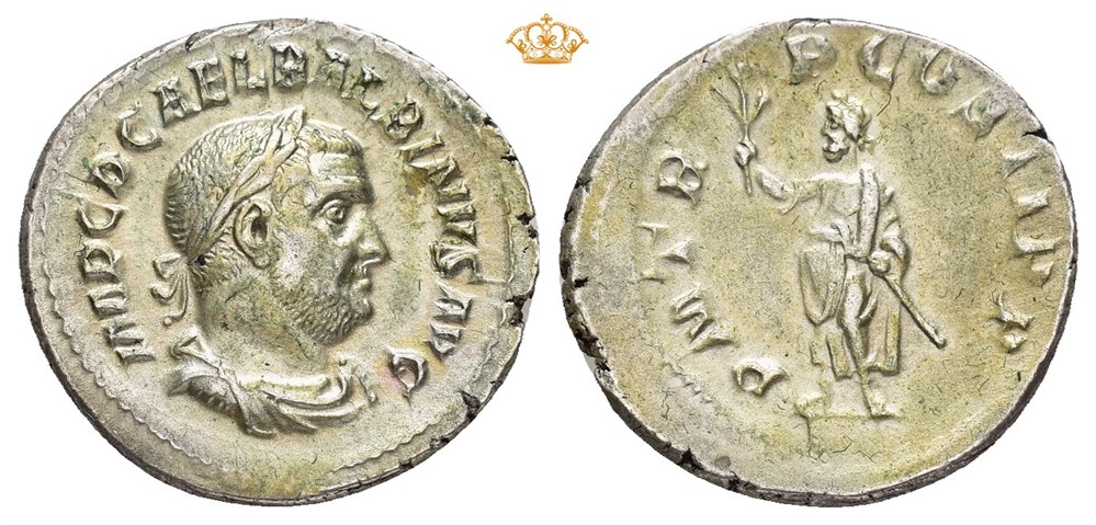 Balbinus 238 AD. AR Denarius (20 mm; 3.17 g). Rome mint. Obverse: IMP C D CAE L BALBINVS AVG, Laureate, draped and cuirassed bust of Balbinus right. Reverse: P M TR P COS II P P, Emperor standing left , holding branch in right hand and a parazonium in left. Toned.