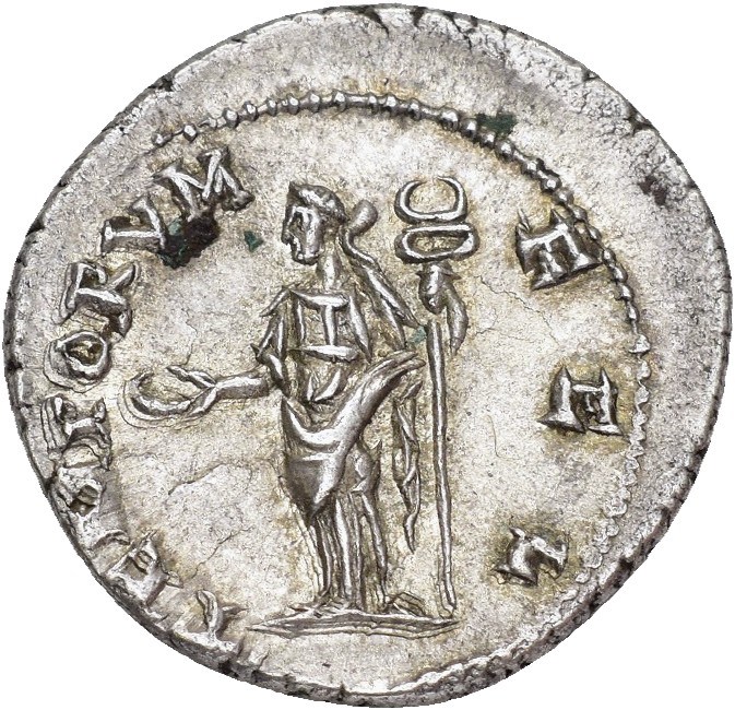 Elagabalus 218-222 AD. AR Denarius (20 mm; 3.54 g). Antioch mint?, struck 219-220 AD. Obverse: ANTONINVS PIVS FEL AVG, Laureate, draped and cuirassed bust right. Reverse: TEMPORVM FEL, Felicitas standing facing, head left, holding patera in right hand and long caduceus in left. Some underlying luster. Lightly toned.