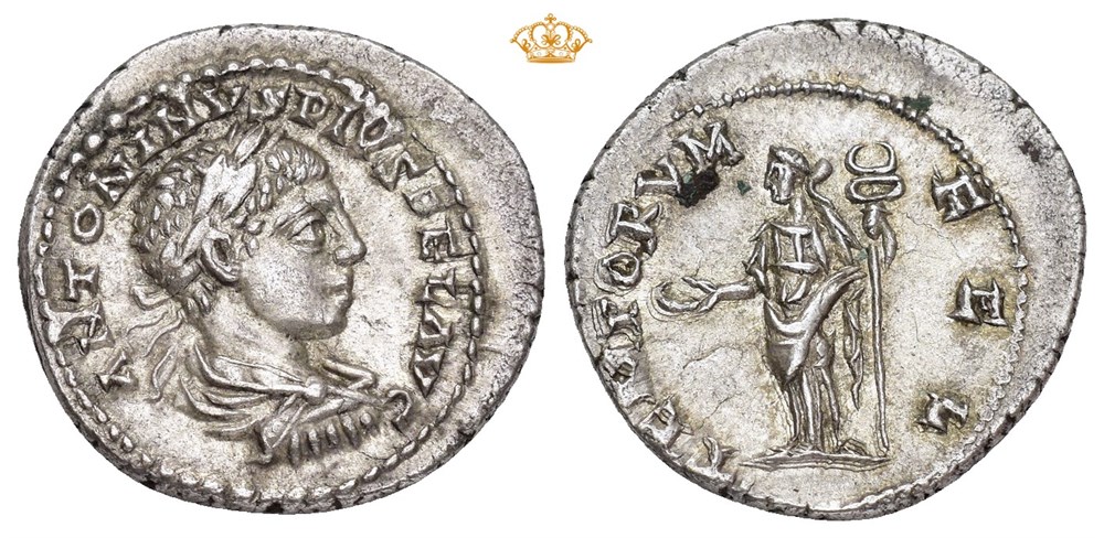 Elagabalus 218-222 AD. AR Denarius (20 mm; 3.54 g). Antioch mint?, struck 219-220 AD. Obverse: ANTONINVS PIVS FEL AVG, Laureate, draped and cuirassed bust right. Reverse: TEMPORVM FEL, Felicitas standing facing, head left, holding patera in right hand and long caduceus in left. Some underlying luster. Lightly toned.
