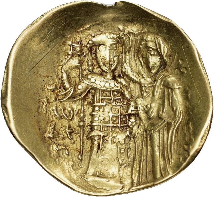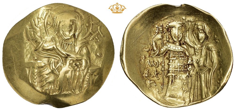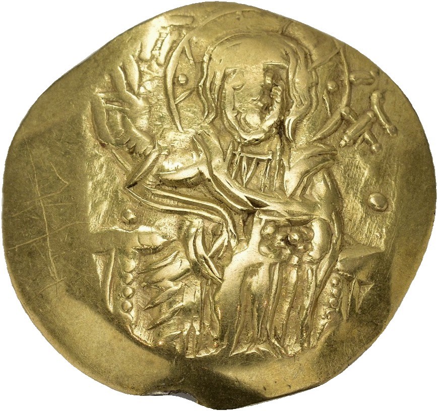John III Ducas (Vatatzes). Emperor of Nicaea, 1222-1254. AV Hyperpyron (26 mm; 4.27 g). Magnesia mint, struck circa 1232-1254 AD. Obverse: IC XI, Christ Pantokrator enthroned facing, raising right hand in benediction and holding Gospels in left. Reverse: Crowned facing figure of John III, wearing loros, holding labarum in right hand and akakia in left, being crowned by the Theotokos to right. Some graffiti in fields.