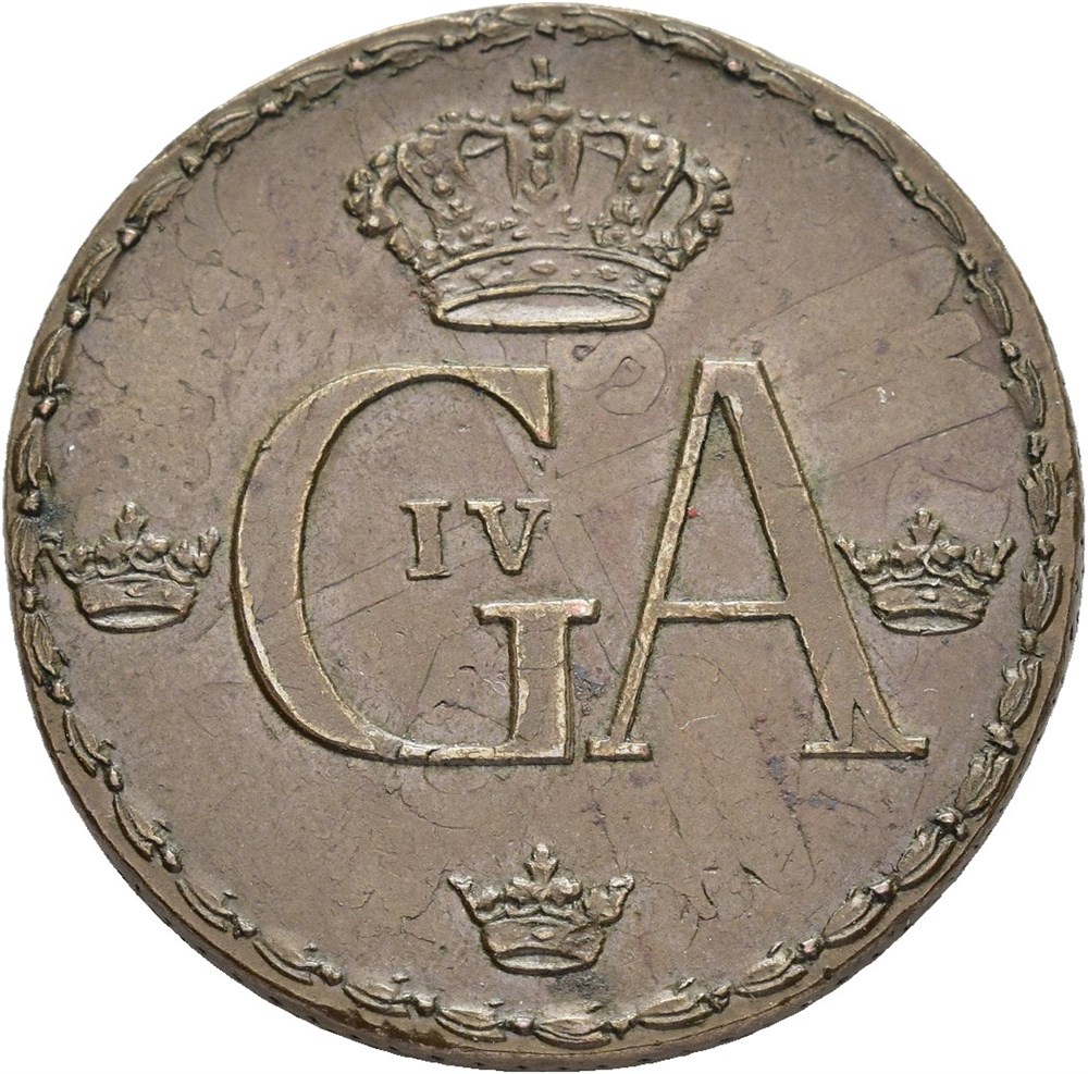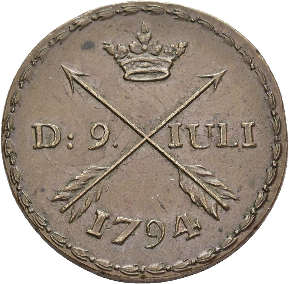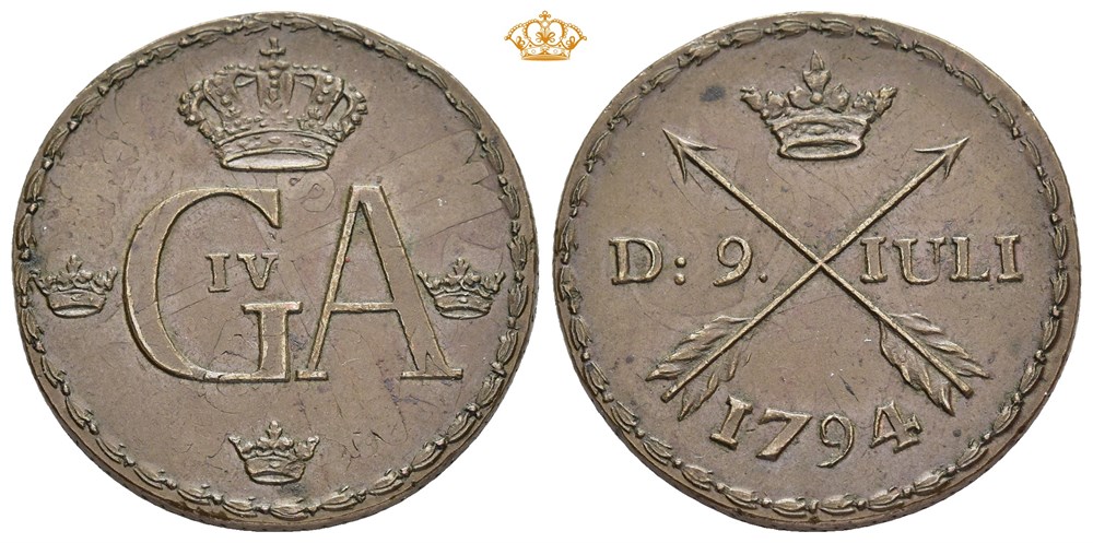 1/2 skilling 1794, Avesta. 13,49 g. Slått i anledning kongens besøk ved Avesta myntverk den 9. juli 1794. Ompreget 1 öre SM.