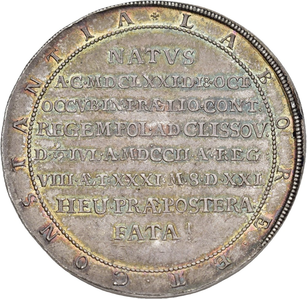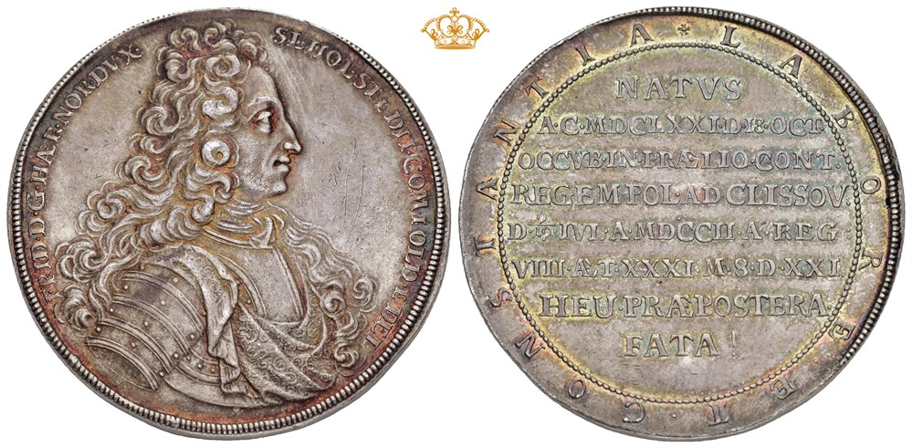 1 1/2 Taler 1702, Tönning. 43.86 g. Commemorative issue for the Duke's death in 1702. Minor scratches in obverse field, edge reworked, but overall a coin with pleasing eye appeal.