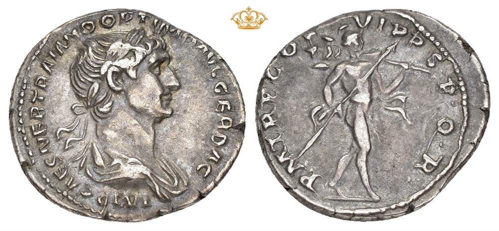 Trajan 98-117 AD. AR Denarius (18.5 mm; 3.52 g). Rome mint, struck circa 114-117 AD. Obverse: IMP CAES NER TRAIANO OPTIMO AVG GER DAC, Laureate and draped bust of Trajan right. Reverse: P M TR P COS VI P P S P Q R, Mars advancing right, holding spear in right hand and trophy in left. Toned.