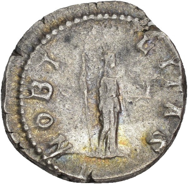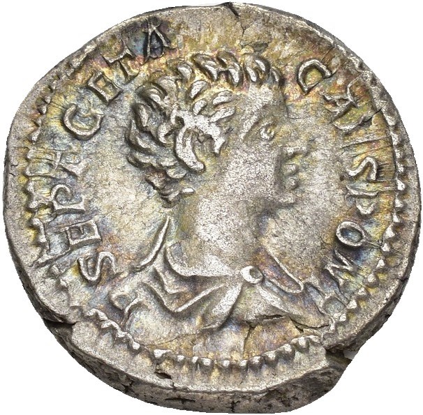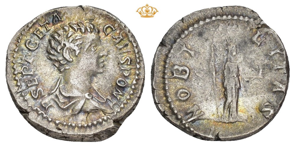 Geta 198-209 AD. AR Denarius (19 mm; 3.65 g). Rome mint, struck 200-202 AD. P SEPT GETA CAES PONT, Bare-headed and draped bust of Geta right. Reverse: NOBILITAS, Nobilitas standing right, holding scepter in right hand and palladium in outstretched left hand. Struck with slightly worn dies. Attractive iridescent toning.