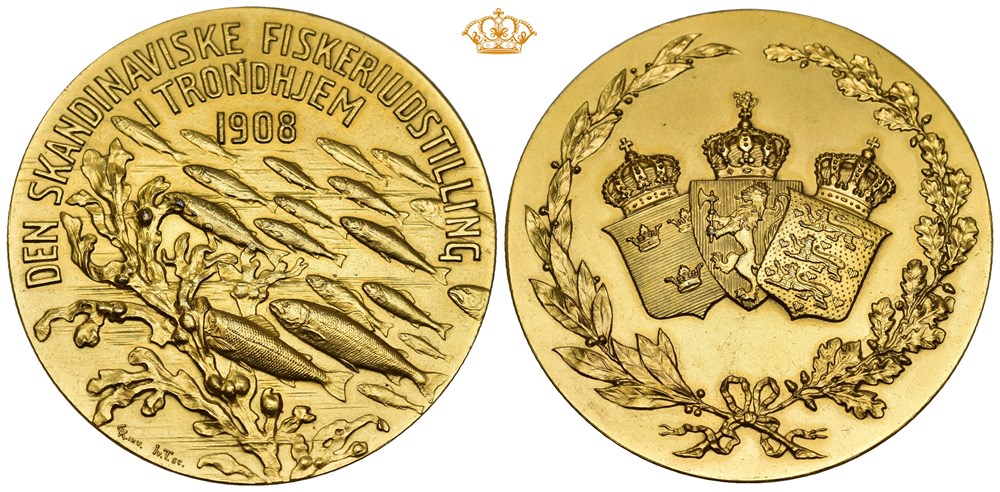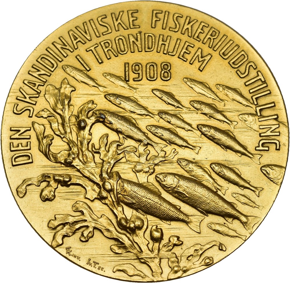 Den skandinaviske fiskeriutstillingen i Trondhjem 1908. Throndsen Forgylt bronse 50 mm; 60,22 g. I originalt etui