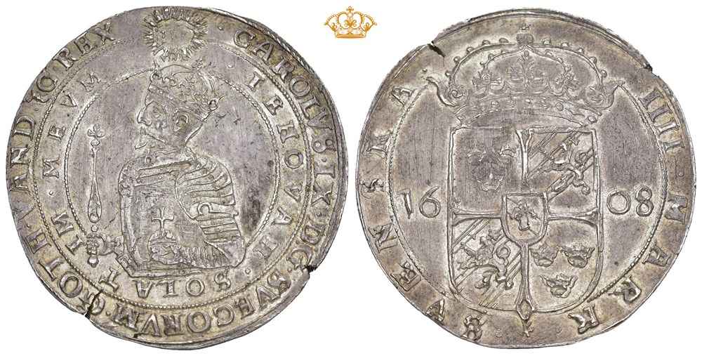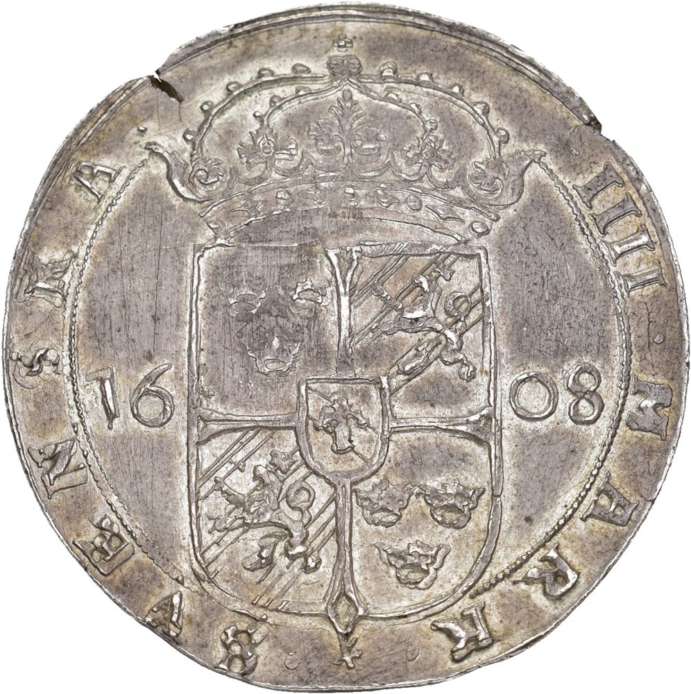4 mark 1608, Stockholm. 18,92 g. Sjelden variant med SOLAT-IM. Blankettfeil.
