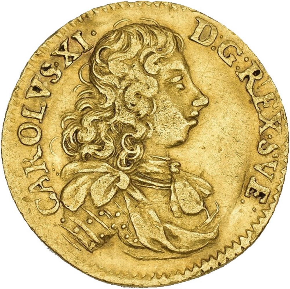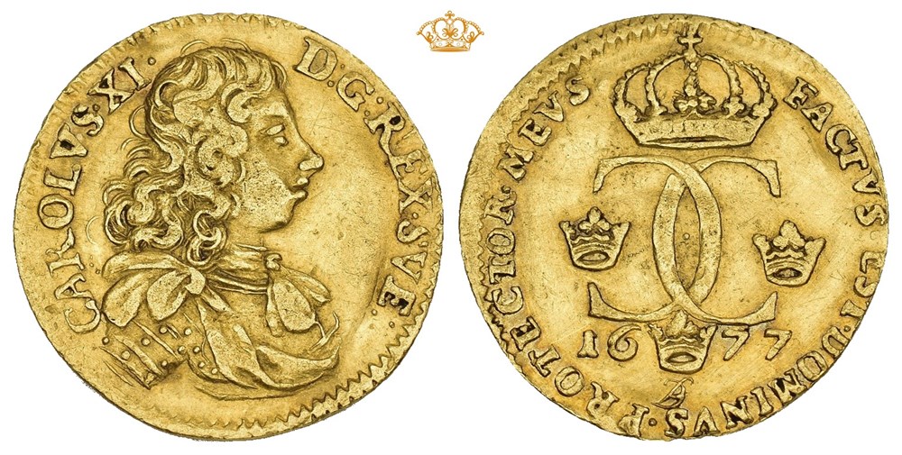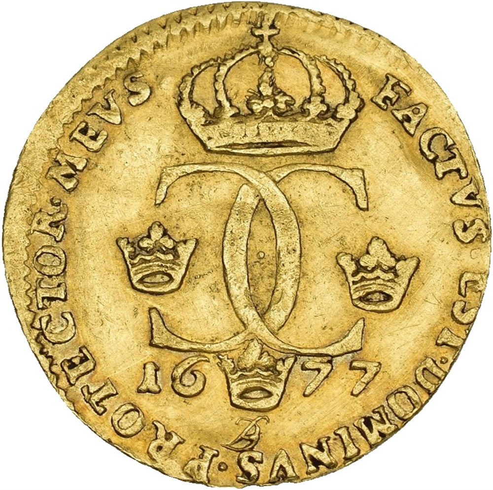 Dukat 1677, Stockholm. 3,41 g. Buklet, riper.
