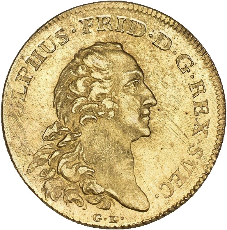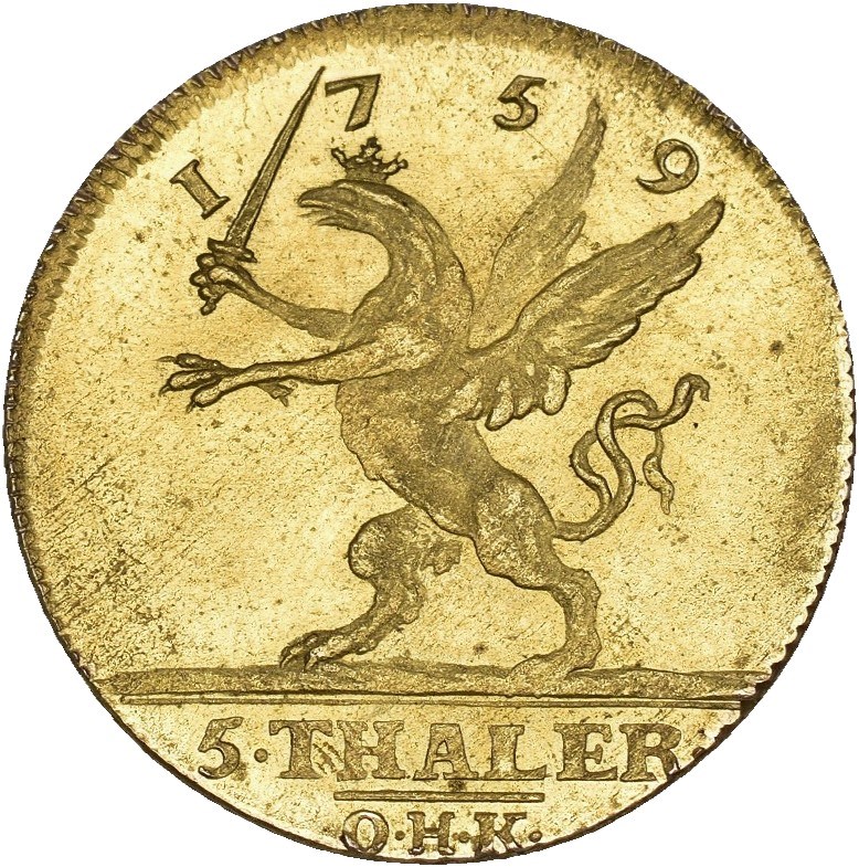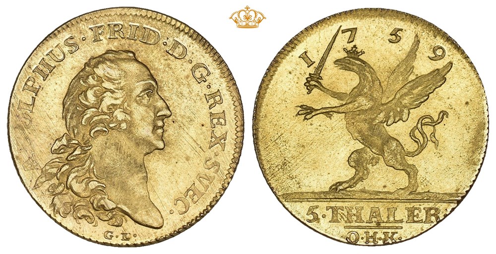 5 taler 1759, Stralsund. 6,65 g. Min. justert. Svært sjelden.