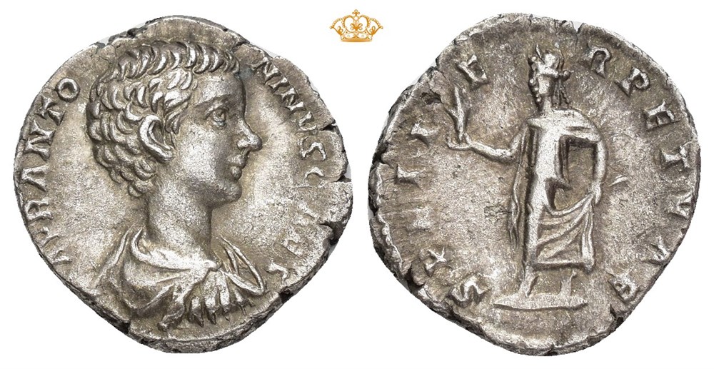 Geta 198-209 AD. AR Denarius (18.5 mm; 2.84 g). Rome mint, struck 198-200 AD. Obverse: L SEPTIMIVS GETA CAES, Laureate, draped and cuirassed bust of Geta right. Reverse: SPEI PERPETVAE, Spes standing left, holding flowers with right hand and lifting up hem of skirt with her left. Flan flaw and minor roughness in fields. Attractively toned.