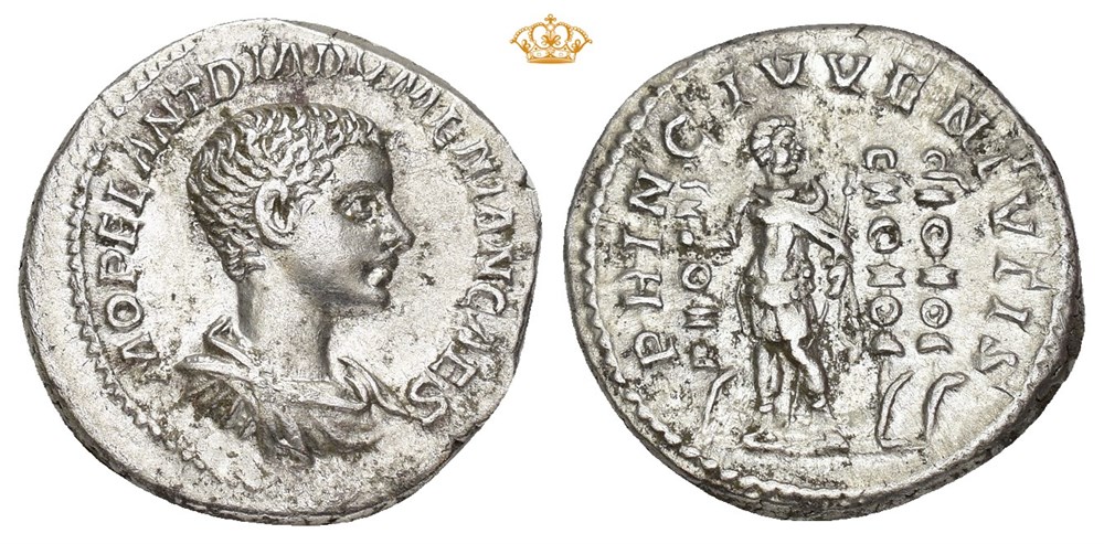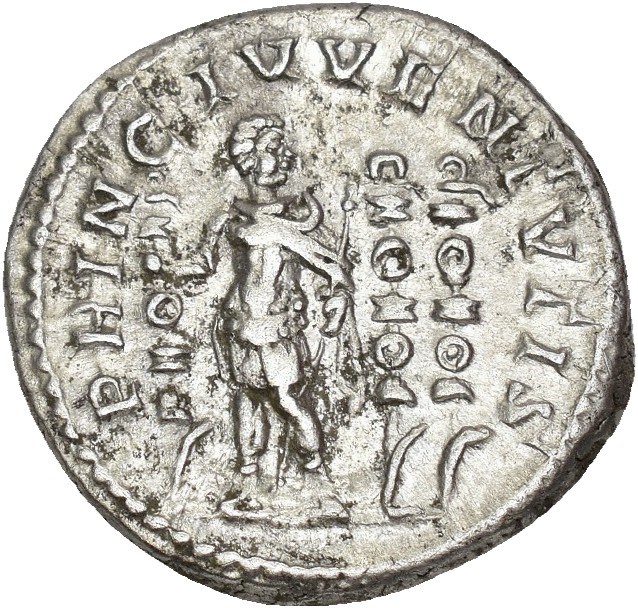 Diadumenian 217-218 AD. AR Denarius (20 mm; 2.99 g). Rome mint, struck 217-218 AD. Obverse: M OPEL DIADVMENIANVS CAES, Draped bust of Diadumenian right. Reverse: PRINC IVVENTVTIS, Diadumenian standing facing in military attire, head right, holding standard in right hand and scepter in left, two signa right field. Lightly toned.