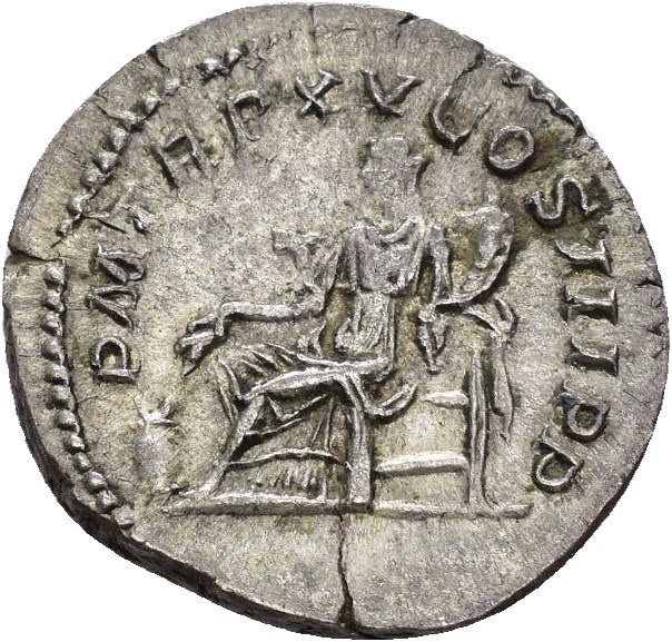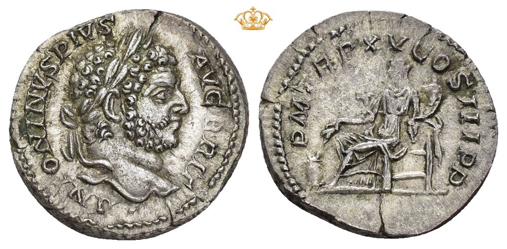 Caracalla 198-217 AD. AR Denarius (18.5 mm; 2.96 g). Rome mint, struck circa 212 AD. Obverse: ANTONINVS PIVS AVG BRIT, Laureate head of Caracalla right. Reverse: P M TR P XV COS III P P, Salus seated left on throne, holding patera in right hand and feeding snake coiled around altar; cornucopia in left arm. Flan cracks and area of weak strike on reverse. Deeply toned.