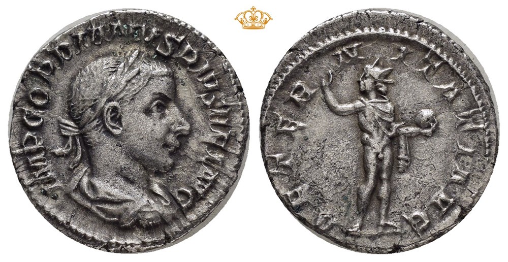 Gordian III 238-244 AD. AR Denarius 241-243 AD, Rome mint, 20mm, 3,26 g. Obverse: IMP GORDIANVS PIVS FEL AVG, bust of Gordian III, with laureate, draped, facing right. Reverse: AETERNITATI AVG, Sol standing, head facing left, raising right hand and holding globus left.